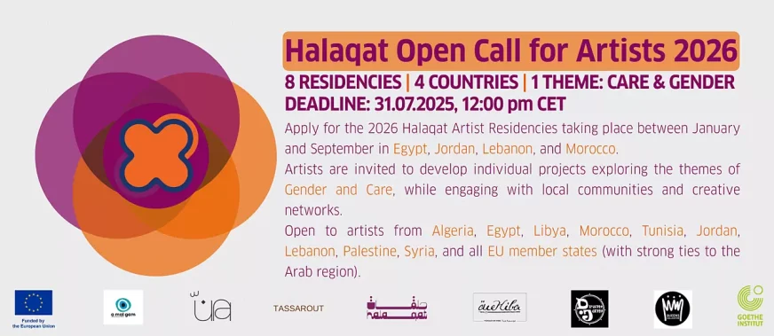 Halaqat invites artists to apply for its new residency programme, taking place between January and September 2026 in Lebanon, Morocco, Jordan, and Egypt. Artists are encouraged to submit individual projects exploring the themes of care and gender.