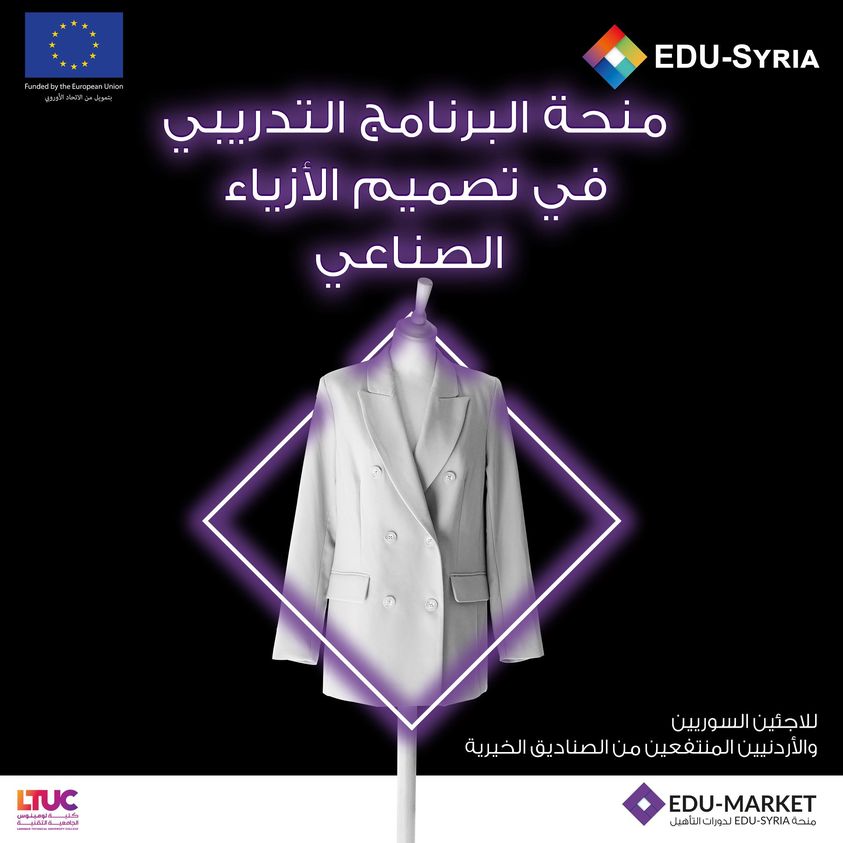 EDU-SYRIA, funded by the EU through the regional trust fund “Madad” in response to the Syrian crisis and managed by the German Jordanian University and implemented by local and international institutions, announces the call for applications to apply for Industrial Fashion Design Training Course Scholarship for 6 months at Luminus Technical University College for Syrian refugees who are holders of the Asylum Seeker Certificate from the United Nations High Commissioner for Refugees (UNHCR), and underprivileged Jordanian who are beneficiaries from one of the following aid organization: National Aid Fund, Tkiyet Um Ali, Al-Aman Fund, and Al-Zakat Fund.
