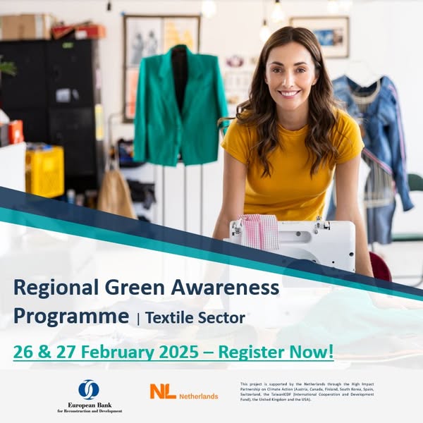 Join us for the EBRD fully-supported regional training program, “𝐑𝐞𝐠𝐢𝐨𝐧𝐚𝐥 𝐀𝐰𝐚𝐫𝐞𝐧𝐞𝐬𝐬 𝐓𝐫𝐚𝐢𝐧𝐢𝐧𝐠 𝐨𝐧 𝐆𝐫𝐞𝐞𝐧 𝐏𝐫𝐚𝐜𝐭𝐢𝐜𝐞𝐬 𝐢𝐧 𝐭𝐡𝐞 𝐓𝐞𝐱𝐭𝐢𝐥𝐞 𝐒𝐞𝐜𝐭𝐨𝐫” in collaboration with Integral RISE. This tailored training is exclusively designed for small and medium-sized enterprises (SMEs) in the Textile sector across 𝐄𝐠𝐲𝐩𝐭, 𝐓𝐮𝐧𝐢𝐬𝐢𝐚, 𝐉𝐨𝐫𝐝𝐚𝐧, 𝐌𝐨𝐫𝐨𝐜𝐜𝐨, 𝐚𝐧𝐝 𝐋𝐞𝐛𝐚𝐧𝐨𝐧. Mark your calendars for the online sessions on 𝐅𝐞𝐛𝐫𝐮𝐚𝐫𝐲 𝟐𝟔𝐭𝐡 𝐚𝐧𝐝 𝟐𝟕𝐭𝐡, 𝟐𝟎𝟐𝟓.