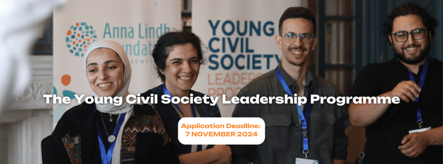 The Young Civil Society Leadership Programme (YCSLP), part of the Med Dialogue for Rights and Equality II, funded by the Directorate-General for Neighbourhood and Enlargement Negotiations (DG NEAR), led by DAI Global Belgium, and implemented by the Anna Lindh Foundation, is launching a call to engage 26 young Mediterranean leaders for its second cohort. The Programme focuses on improving the skills of civil society leaders who show potential in policymaking, policy dialogue and advocacy. Thematic focus of this second cycle will be “Promoting Just Transition”