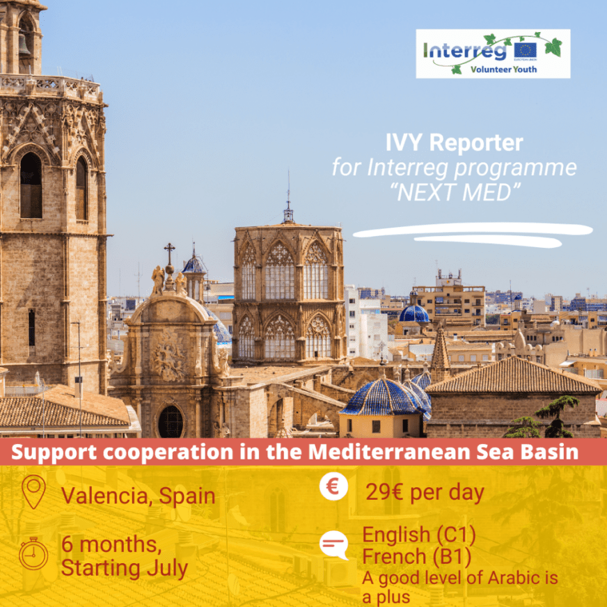 We have an exciting opportunity for you! Become an Interreg Youth Volunteer (IVY) and join our Branch Office in Valencia, Spain for a period of 6 months starting from July. This is a unique occasion to contribute to the communication and dissemination activities of the Interreg NEXT MED Programme and develop your skills in a multicultural and dynamic environment.