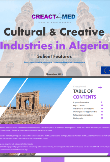 This report on the current landscape of cultural and creative industries (CCI) in Algeria gives a brief overview of the country political and economic contexts, and the salient features of its existing CCI and entrepreneurial ecosystems. It identifies relevant key stakeholders including governmental entities, private sector organisations, NGOs and associations, and academic institutions, as well as national and international initiatives that can benefit the CCI. The report outlines challenges and opportunities within the CCI sector in Algeria, and gives a series of policy recommendations towards strenthening the ecosystem.
