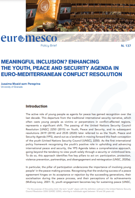 This paper explores the Youth, Peace, and Security (YPS) Agenda’s impact on youth involvement in conflict resolution, focusing on Euro-Mediterranean regions, specifically post-Arab Spring Yemen and Libya. The YPS Agenda emphasizes five pillars: participation, protection, violence prevention, partnerships, and disengagement/reintegration.