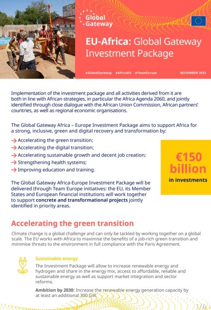 The Global Gateway Africa – Europe Investment Package aims to support Africa for a strong, inclusive, green and digital recovery and transformation by: accelerating the green transition; accelerating the digital transition; accelerating sustainable growth and decent job creation; strengthening health systems; improving education and training. The Global Gateway Africa-Europe Investment Package will be delivered through Team Europe initiatives: the EU, its Member States and European financial institutions will work together to support concrete and transformational projects jointly identified in priority areas.