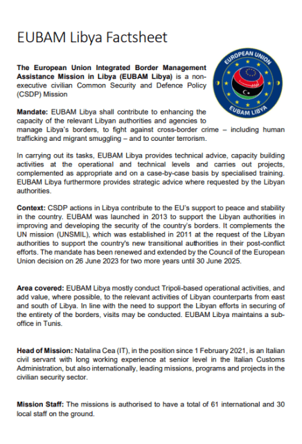 The European Union Integrated Border Management Assistance Mission in Libya (EUBAM Libya) is a non-executive civilian Common Security and Defence Policy (CSDP) Mission. It helps Libyan authorities manage borders and fight cross-border crime like human trafficking, migrant smuggling and terrorism.