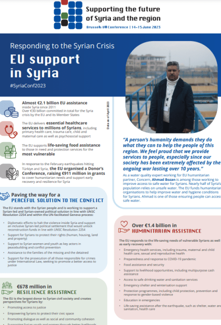This factsheet highlights the European Union support in Syria, including the peaceful solution to the conflict, the resilience assistance and the humanitarian assistance.