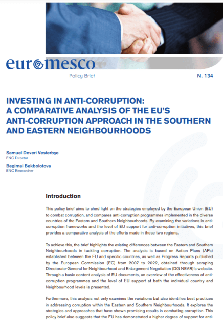 This policy brief presents an insightful analysis of the European Union’s (EU) strategies to combat corruption in the Eastern and Southern Neighbourhoods. Through a comparative examination of anti-corruption programmes in diverse countries and the level of EU support, the study highlights variations and best practices in addressing corruption. The analysis is based on Action Plans and Progress Reports published by the European Commission from 2007 to 2022, obtained through scraping the Directorate-General for Neighbourhood and Enlargement Negotiation’s website.