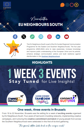 EU Neighbours South is the EU’s Regional Communication Programme for the Southern Neighbourhood. It aims to raise awareness, increase knowledge and improve public understanding of the European Union and its policies, enhance strategic communication actions and build resilience against disinformation in the Southern Neighbourhood.
