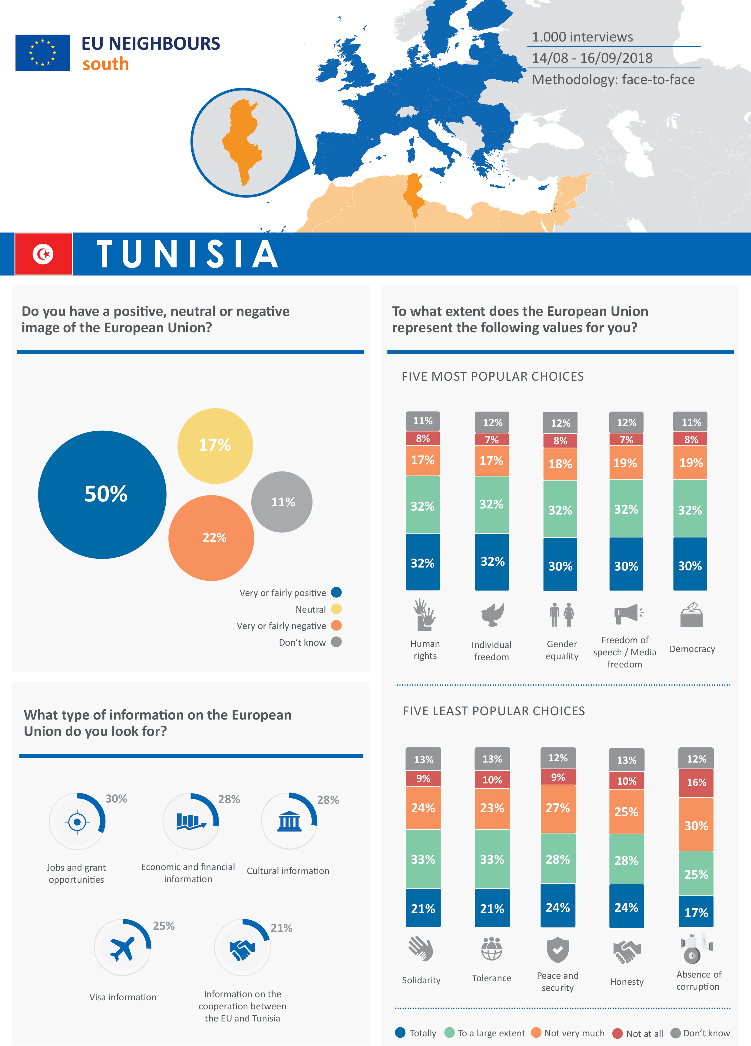 This survey – part of a wave of opinion polls carried out in eight southern Neighbourhood partner countries – was conducted in Morocco between July and September 2021, with 1,000 people consulted in face-to-face interviews. Respondents were asked about their general perceptions of the EU and the values with which it is associated, about EU relations with their country, and the impact of EU financial support, including in supporting their country’s response to the COVID-19 crisis. The surveys also look at preferred sources of information, how people feel about their personal situation and the situation in their country, and their expectations for the future.