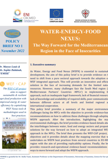 This brief first presents an overview of the Water-Energy-Food Challenges in the South Mediterranean region, then examines the challenges and opportunities for the adoption of an Integrated WEFN approach in the 4 studied countries (Egypt, Jordan, Lebanon and Tunisia) to provide some insights on the enterprise of future nexus projects in the region and for integrated governance. The brief finally provides evidence-based recommendations on ways to move forward and adopt the WEFN approach.