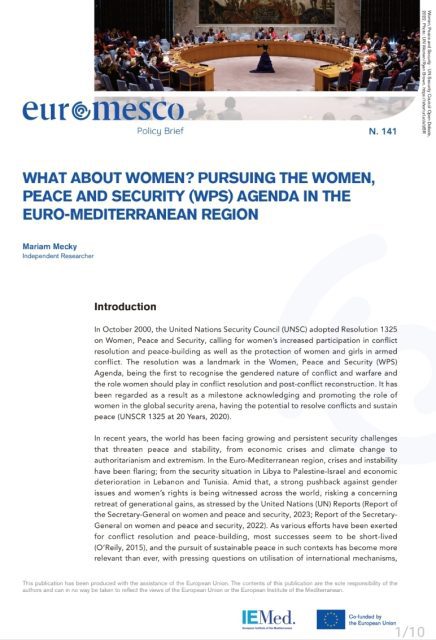 This Policy Brief delves into the Women, Peace, and Security (WPS) Agenda in the Euro-Mediterranean region, particularly focusing on the progress and potential of United Nations Security Council Resolution 1325 (UNSCR 1325). The paper addresses the evolving dynamics in the region and the importance of utilising the WPS Agenda as an inclusive framework for stability and conflict resolution. It critically examines the implementation of UNSCR 1325, highlighting the challenges and offering nuanced insights.
