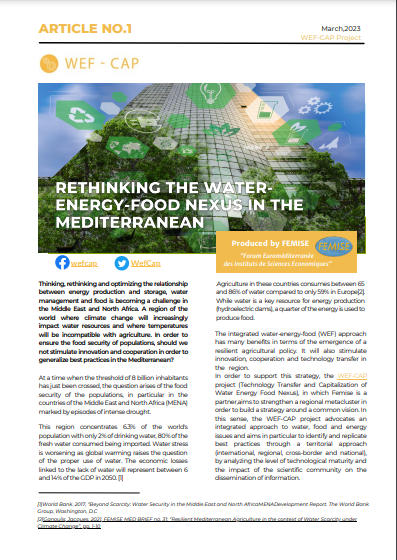 The integrated approach to efficient use of water and energy resources will contribute to food security through the development of smart agriculture and the contribution of solution providers. At the government level, an evolution of the legal framework to optimize management in a context of scarce resources is recommended, as well as the improvement of collaboration and communication between ministries. With the now inevitable rise in temperatures, it will be necessary to show inventiveness and resilience to build an ecosystem with neighboring countries. Societal adaptation to climate change in the European Union and Mediterranean partners countries is becoming an imperative necessity.