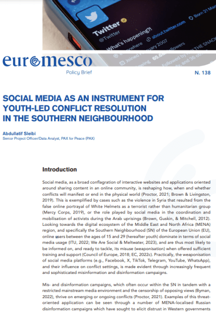 region, and specifically the Southern Neighbourhood (SN) of the European Union (EU), online users between the ages of 15 and 29 (hereafter youth) dominate in terms of social media usage (ITU, 2022; We Are Social & Meltwater, 2023), and are thus most likely to be informed on, and ready to tackle, its misuse (weaponisation) when offered sufficient training and support (Council of Europe, 2018; EC, 2022c). Practically, the weaponisation of social media platforms (e.g., Facebook, X, TikTok, Telegram, YouTube, WhatsApp), and their influence on conflict settings, is made evident through increasingly frequent and sophisticated misinformation and disinformation campaigns.