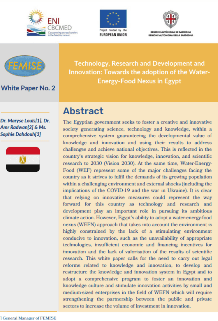 This white paper calls for the need to carry out legal reforms related to knowledge and innovation, to develop and restructure the knowledge and innovation system in Egypt and to adopt a comprehensive program to foster an innovation and knowledge culture and stimulate innovation activities by small and medium-sized enterprises in the field of WEFN which will require strengthening the partnership between the public and private sectors to increase the volume of investment in innovation.