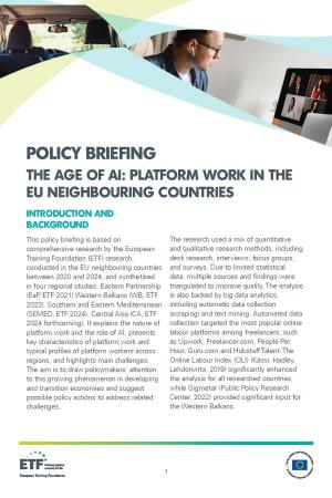 Based on comprehensive research carried out by the ETF between 2020 and 2024, this paper explains the nature of platform work and the role of AI, presents key characteristics of platform work and typical profiles of platform workers across regions, and highlights main challenges. The aim is to draw policymakers’ attention to this growing phenomenon in developing and transition economies and suggest possible policy actions to address related challenges.
