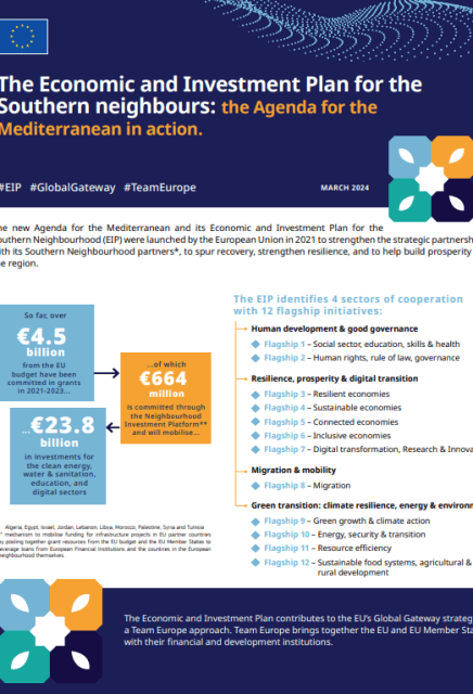 The new Agenda for the Mediterranean and its Economic and Investment Plan for the Southern Neighbourhood (EIP) were launched by the European Union in 2021 to strengthen the strategic partnership with its Southern Neighbourhood partners*, to spur recovery, strengthen resilience, and to help build prosperity in the region.