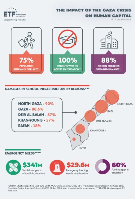 Since the beginning of the Israeli-Hamas conflict on 7 October 2023, the ETF has been monitoring and collating data from a wide range of information sources. Our aim is to track and review the impact of the crisis on education infrastructure and on the movement of people, as well as the consequences for the labour market and the effect on education. The compilation of information provides a snapshot of how the situation is unfolding. It also reports on what the future may hold in terms of reconstruction, recovery of the private sector and the long-term impact on education.
