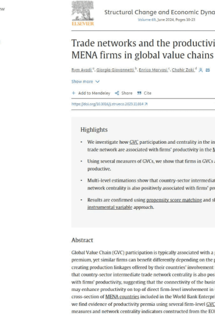 The authors show that country-sector intermediate trade network centrality is also positively associated with firms’ productivity, suggesting that the connectivity of the business environment may enhance productivity on top of direct firm-level involvement in GVCs. For a large cross-section of MENA countries included in the World Bank Enterprise Surveys (WBES), they find evidence of productivity premia using several firm-level GVC participation measures and network centrality indicators constructed from the EORA input-output tables.