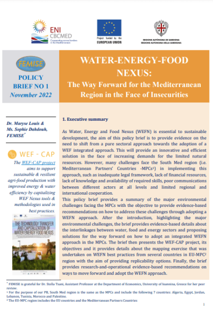 By 2050, food imbalance in EU-MPC is forecast to reach 60%. Sustainable water resources management is closely related to food security as 70% of global freshwater withdrawals are driven by agriculture. Energy plays a key role in producing/distributing food as well as in extracting/treating/supplying water. Climate projections to 2050 reflect an average temperature increase of 2°C, leading to a 5–10% fall in precipitation and more frequent extreme climatic events, potentially halving agricultural production by 2100. Beyond political uncertainty, generalized economic slowdown, and macroeconomic instability, EUMPC region also needs societal adaptation to climate change through new cross-sectoral approaches to manage energy/water resources and efficiently produce more food for an increasing population. Furthermore, the recent COVID19 pandemic exposed the fragility of supply chains, the importance of localized production, and the importance of investment in and capitalization of key enabling technologies, and the need to foster vulnerable groups.