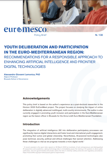 This paper focuses on the Euro-Mediterranean region and offers a thoughtful examination of AI’s current and future role. It provides practical suggestions for EU and Union for the Mediterranean (UfM) policy-makers to empower Euro-Mediterranean youth in three key areas: education, engagement, and research.