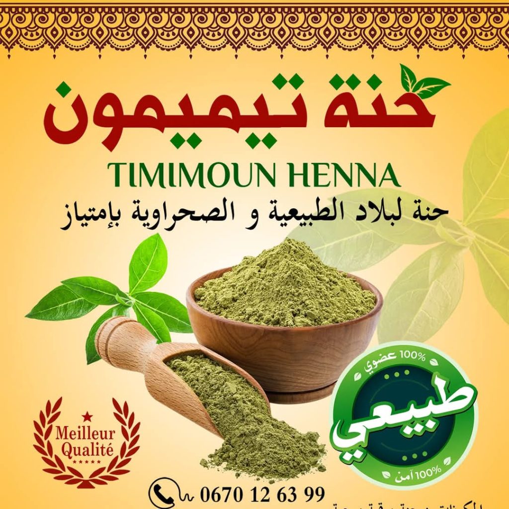 Henna is harvested three times a year, yielding up to five quintals annually, and is processed into powder for cosmetic and wellness use. Timimoun Henna produces 30,000 sachets a year, all made from 100% natural, chemical-free ingredients. Fatima proudly describes her brand as 100% bio.