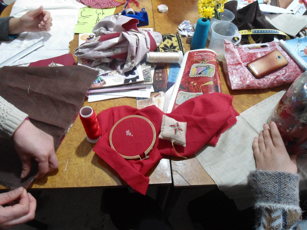 Bent over the side of a table, Asma Mokhtari encourages her colleague Sarah to keep going, showing her where to point the needle over the long piece of red fabric. Standing nearby to help them steady the cotton square is Soumia, a 34-year-old tailor seamstress from Algiers.